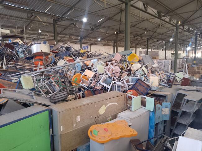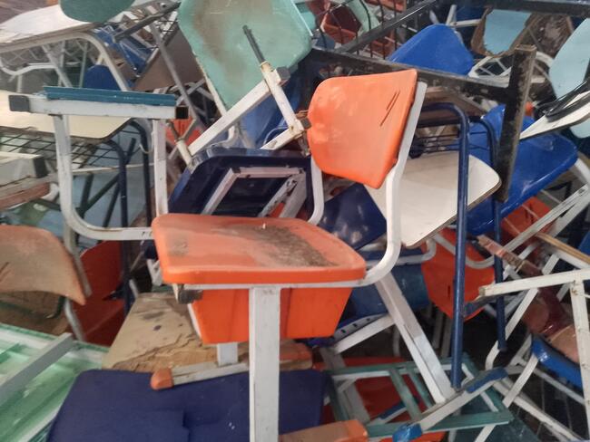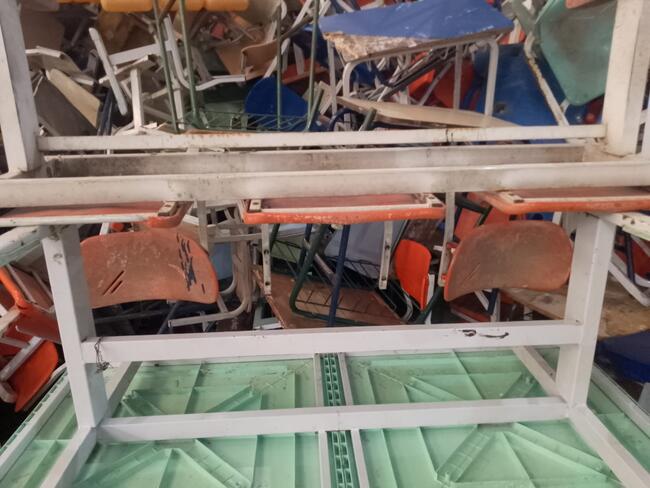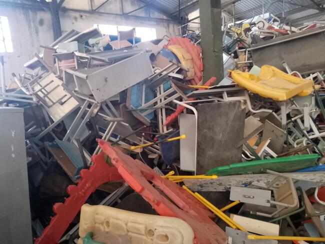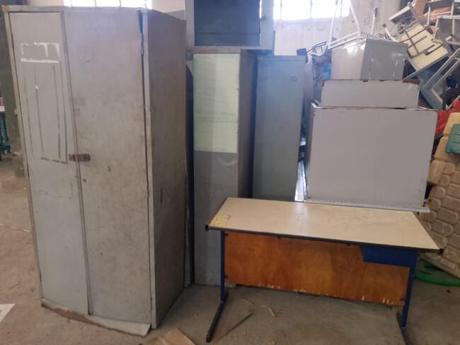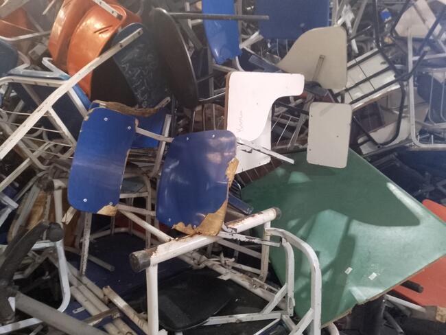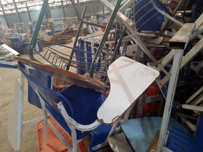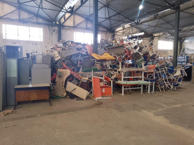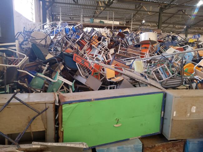 Mobiliário - aproximadamente 1 300 itens - mesas, cadeiras, carteiras escolares, arquivos de aço, lousas, etc..